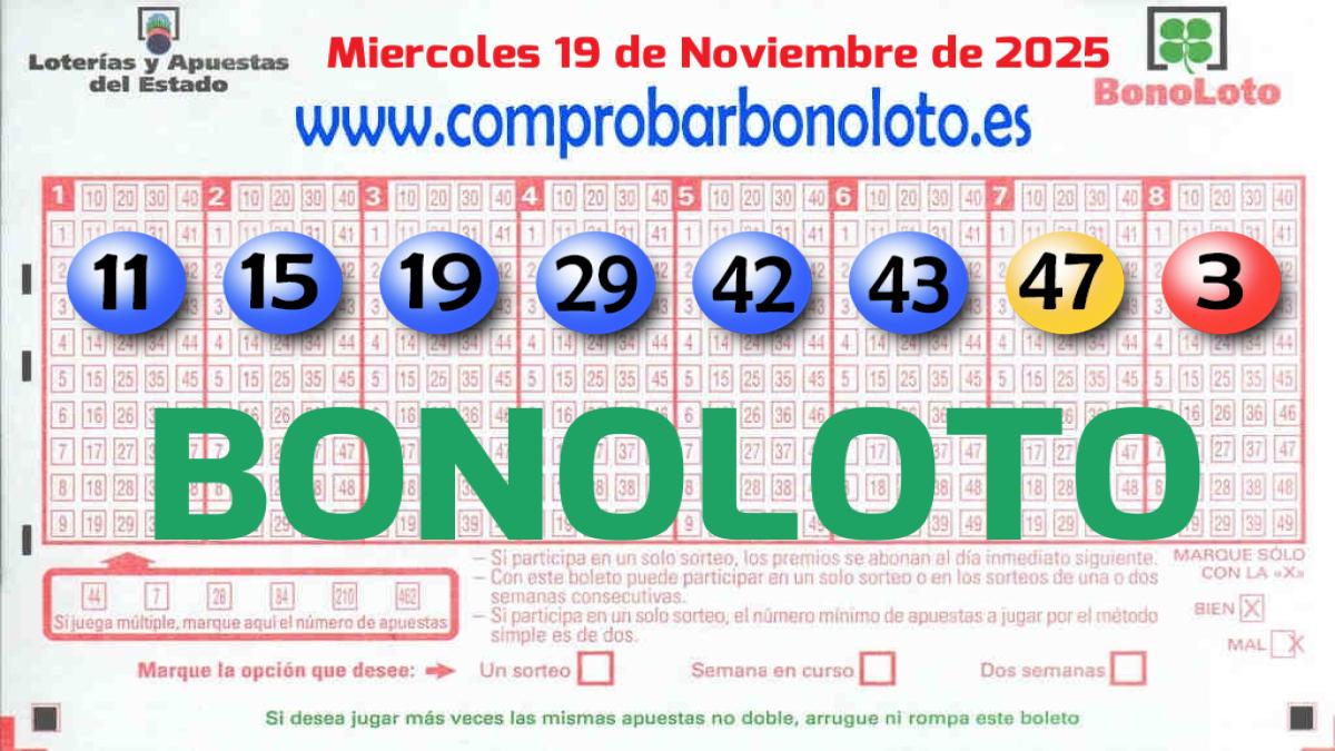 Sí tienes boletos de la Bonoloto de hoy Miércoles 19 de Noviembre de 2025 haz clic en el vídeo para comprobar los resultados y descubre si eres el próximo ganador. También puedes comprobar tu Bonoloto con la cámara del movil o tecleando la combinación de tu boleto.| Categoría | Apuestas | Premios |