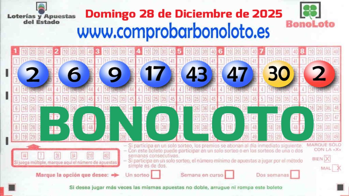 ![]() | Sorteo de Lototurf celebrado el Domingo 28 de Diciembre de 2025. Resultados Lototurf: 2 - 4 - 7 - 15 - 18 - 30 C(4) R(4) |