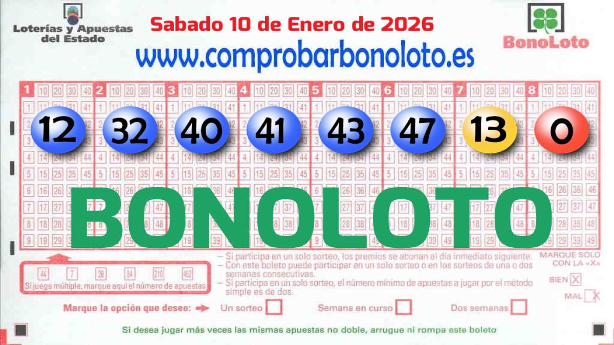 Sí tienes boletos de la Bonoloto de hoy Sábado 10 de Enero de 2026 haz clic en el vídeo para comprobar los resultados y descubre si eres el próximo ganador. También puedes comprobar tu Bonoloto con la cámara del movil o tecleando la combinación de tu boleto.| Categoría | Apuestas | Premios |